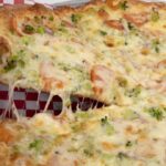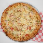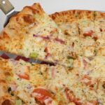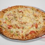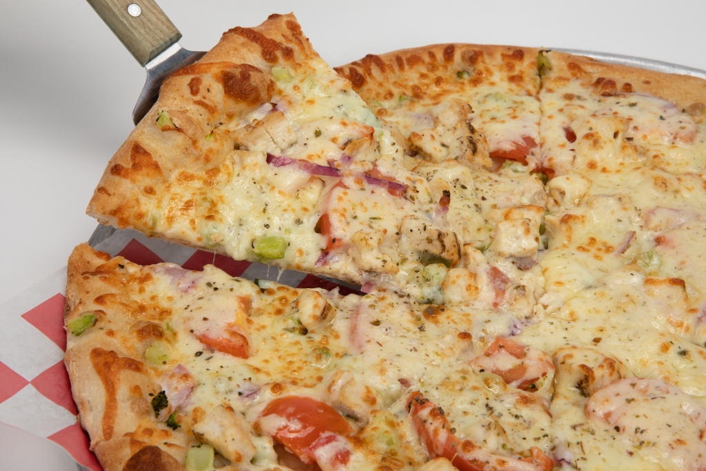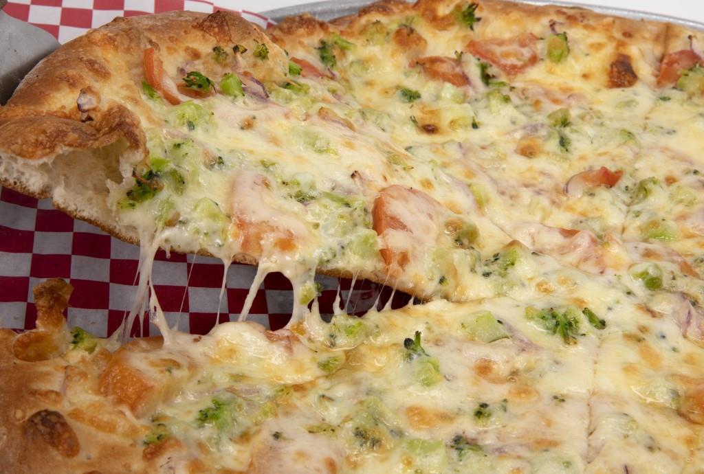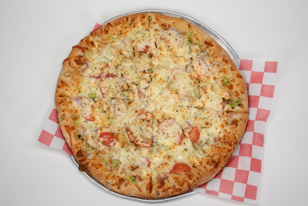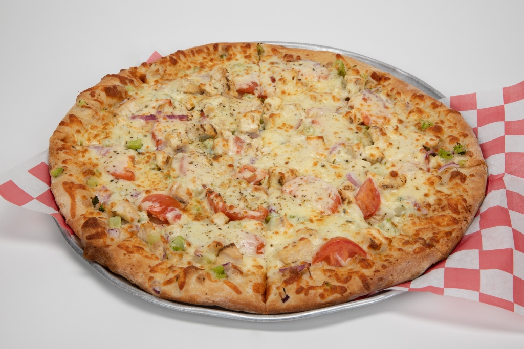 Thin crust, three-cheese blend, red onion, Roma tomatoes and broccoli swirl of white garlic pizza sauce all topped with our special seasonings. Get an optional swirl of balsamic glaze dressing. Add artisan diced chicken for the price of a specialty topping.